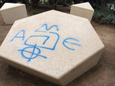 Χθες βράδυ άγνωστοι σχημάτισαν με μπλε σπρέι το σύμβολο της οργάνωσης «Ανένταχτοι Μαιάνδριοι Εθνικιστές» (ΑΜΕ). Την προηγούμενη φορά που συνέβη κάτι αντίστοιχο ήταν στις 27 Ιουνίου.
