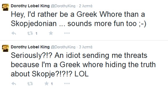Έξαλλη με τους Σκοπιανούς που της στέλνουν απειλητικά μηνύματα και την χαρακτηρίζουν «Ελληνίδα πόρνη» μέσω Twitter είναι η Αμερικανίδα αρχαιολόγος Ντόροθι Κινγκ. «Θα προτιμούσα να είμαι Ελληνίδα πόρνη παρά Σκοπιανή… Νομίζω θα ήταν πιο διασκεδαστικό» απάντησε η αρχαιολόγος, η οποία αποδίδει την εναντίον της επίθεση στο ότι υποστηρίζει πως τα Σκόπια «δεν ήταν ποτέ Μακεδονία».