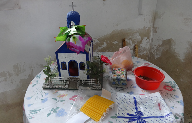 Κεράκια πλάι σε ένα αυτοσχέδιο παιδικό έργο αναπαράστασης ναού και λίγα ψιλά, απείραχτα, για τη συντήρηση του ναού