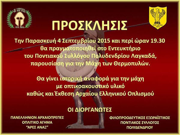Μια βουτιά στην ιστορία της Αρχαίας Ελλάδας ετοιμάζεται να κάνει ο Φιλοπροοδευτικός Εξωραϊστικός Ποντιακός Σύλλογος Πολυδενδρίου, μεταφέροντας τα μέλη και τους φίλους του σε άλλες εποχές. Την Παρασκευή 4 Σεπτεμβρίου (ώρα 19:30) στην μεγάλη αίθουσα του συλλόγου θα παρουσιαστεί οπλισμός από την Αρχαία Ελλάδα σε συνεργασία με το Πανελλήνιο Αρχαιοπρεπές Οπλιτικό Άγημα «ΑΡΕΣ ΑΝΑΞ».