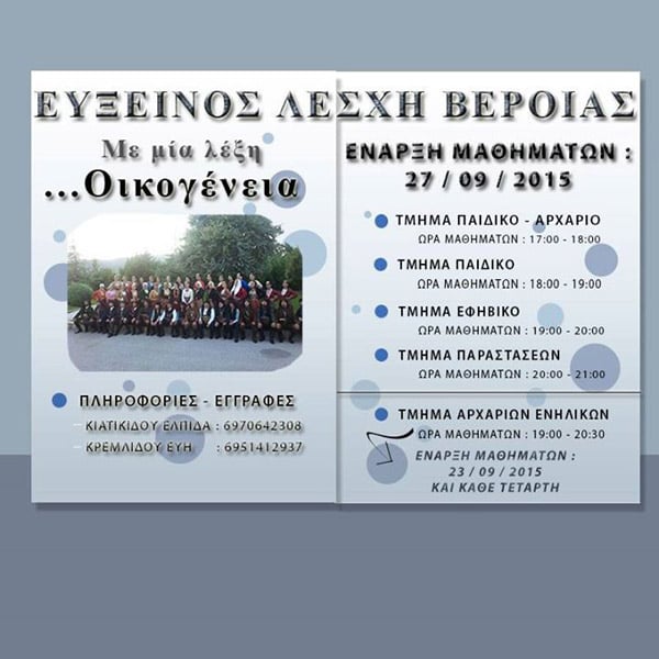 Η Εύξεινος Λέσχη Βέροιας επιστρέφει δριμύτερη τη νέα χορευτική περίοδο 2015-2016 που ξεκινά σε λίγες ημέρες. Τα μέλη του συλλόγου, μετά την αποφόρτιση των καλοκαιρινών διακοπών, επανέρχονται στα μαθήματα ποντιακών χορών και στην οικογένεια της Ευξείνου Λέσχης Βέροιας.