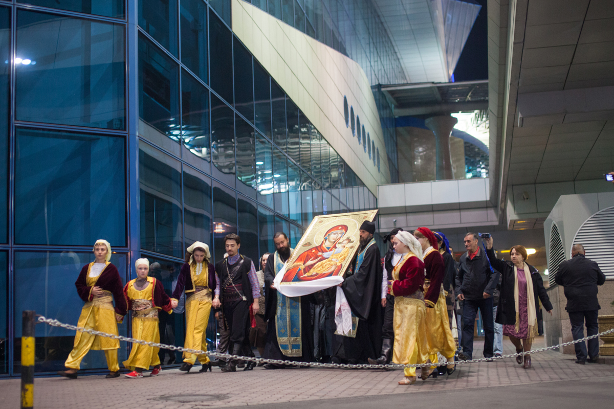 В Покровском храме провели молебен. Кадры хроники встречи иконы и первых часов пребывания ее в Алма-Ате войдут в фильм о казахстанских греках, который снимает по заказу благотворительного фонда Ивана Игнатьевича Саввиди известный режиссер-документалист Константинос Харалампидис.