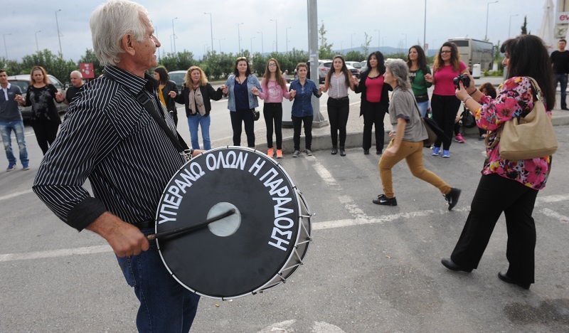 Κρατώντας στο ένα χέρι το νταούλι του και στο άλλο τα ηχεία, σχεδόν πήδηξε από το λεωφορείο ο γνωστός Πόντιος νταουλιτζής της Θεσσαλονίκης Κώστας Ψαθάς κι έδωσε το σύνθημα να ξεκινήσει ο χορός.