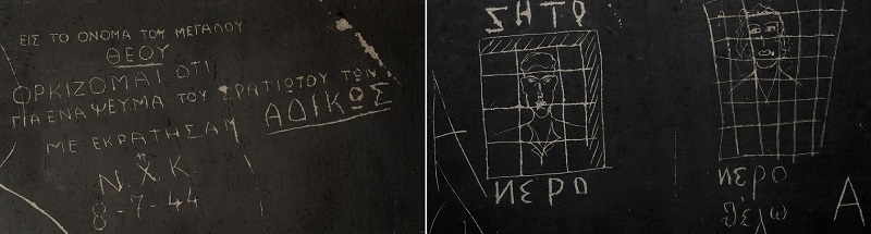 Οι τοίχοι των κρατητηρίων του δεύτερου υπογείου, και σε περιορισμένο βαθμό και του πρώτου, γεμίζουν με εγχάρακτα μηνύματα, χρονολογίες, σχέδια. Η ιστορική μνήμη ακόμα και σήμερα παραμένει ανεξίτηλη, παρά το γεγονός ότι οι Γερμανοί φρόντιζαν να βάφουν επανειλημμένα τους τοίχους.