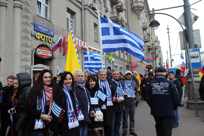 Москва – многонациональный город. В числе десятков национальных общин, пришедших на праздничное шествие, колона греков Москвы. Национальные флаги России, Греции, исторические стяги Византии и Понтийского эллинизма.
