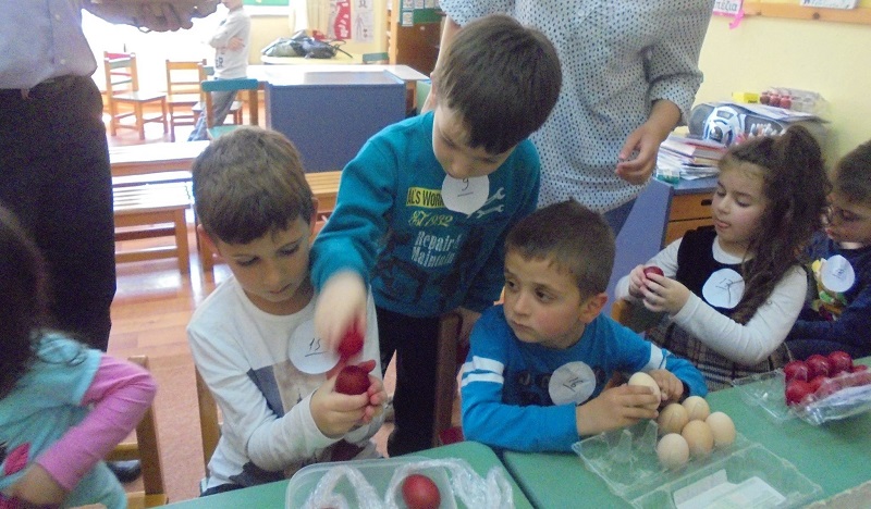 Οι δέκα μικροί «αυγομάχοι» έδωσαν τον τελευταίο τους αγώνα με δέκα γερά αυγά κότας, βαμμένα κόκκινα, με τους συμμαθητές τους και τους νηπιαγωγούς τους να τους εμψυχώνουν σχηματίζοντας… κερκίδα.