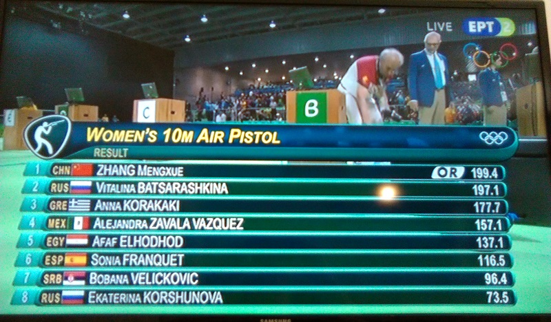 Η Ελληνίδα πρωταθλήτρια κατέκτησε το πρώτο ελληνικό μετάλλιο στη σκοποβολή μετά το 1920, όταν η εθνική ομάδα ανδρών είχε πάρει ασημένιο στην Αμβέρσα, στο αυτόματο πιστόλι 30μ. Το χρυσό μετάλλιο κατέκτησε η Κινέζα Ζανγκ Μενγκχούε (199.4), ενώ το ασημένιο πήρε η Ρωσίδα Βιταλίνα Μπατσαράσκινα (197.1).
