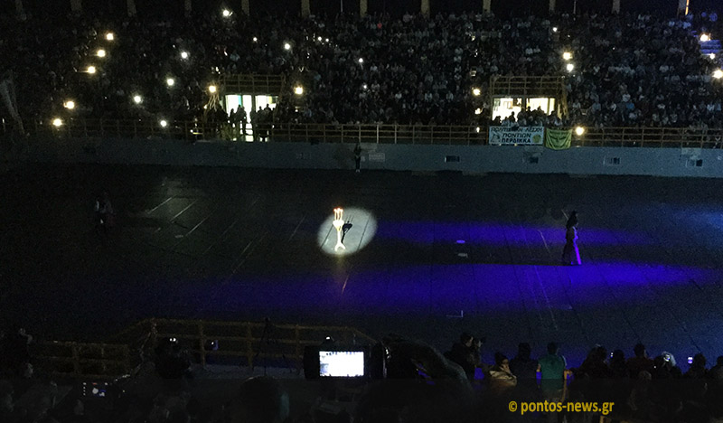 Η μουσική έγινε πιο δυναμική και από στις δύο κεντρικές εισόδους του αγωνιστικού χώρου ξεπρόβαλαν τα λάβαρα των ποντιακών σωματείων, με μπροστάρη την ελληνική σημαία.