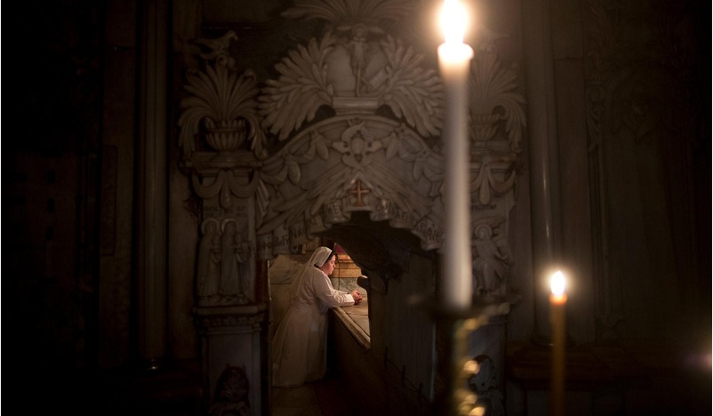 »Κάτω από την μαρμάρινη πλάκα του κάλφα Κομνηνού, του φημισμένου αρχιτέκτονα που είχε κάνει την αποκατάσταση του τάφου το 1810, βρήκαμε μια πλάκα μάλλον σταυροφοριακή –αυτό τεκμαίρεται από το χαρακτηριστικό σταυρό των Σταυροφοριών που φέρει επάνω της. Και από κάτω βρήκαμε την κοίτη του βράχου που θεωρείται ότι τοποθετήθηκε το σώμα του Ιησού.