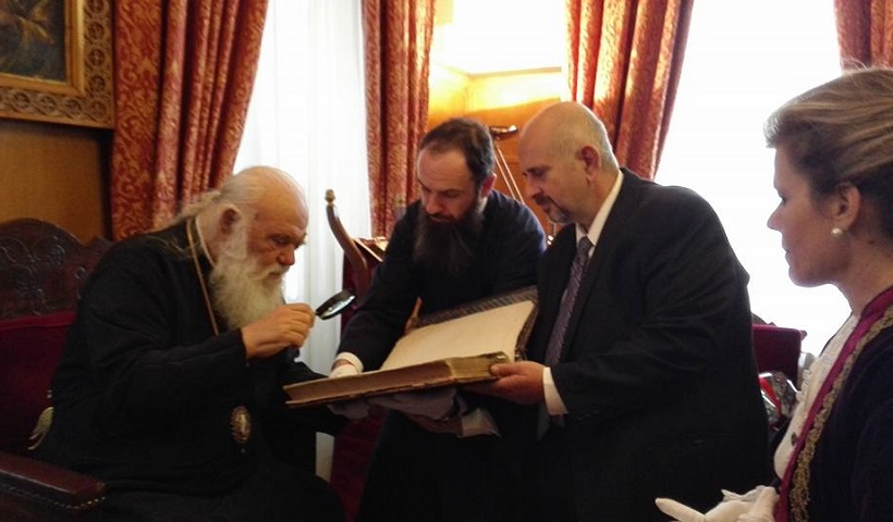 Ο αρχιεπίσκοπος Αθηνών Ιερώνυμος εξερευνά διασωθέντα βιβλία από τη Βιβλιοθήκη της Αργυρούπολης του Πόντου