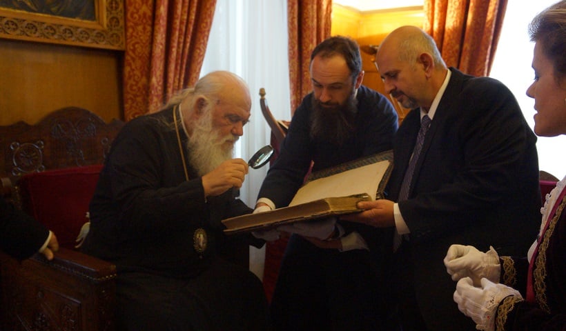 Ο Φώτης Φανιάδης (δεξιά) δείχνει στον Αρχιεπίσκοπο ένα βιβλίο-κειμήλιο από την Αργυρούπολη