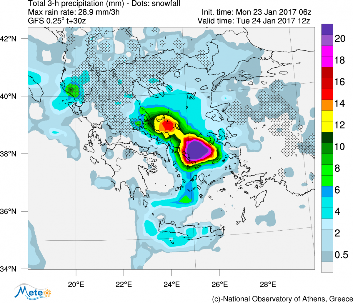 Σε Θεσσαλία, ανατολική Στερεά, Εύβοια και ανατολική Πελοπόννησο προβλέπονται νεφώσεις με βροχές και καταιγίδες οι οποίες μέχρι το μεσημέρι στην Πελοπόννησο (κυρίως στα παραθαλάσσια) θα είναι κατά τόπους ισχυρές. Χιονοπτώσεις κατά τόπους πυκνές θα σημειωθούν μέχρι το απόγευμα στα ορεινά-ημιορεινά της κεντρικής Στερεάς και της Θεσσαλίας. Οι άνεμοι από ανατολικές διευθύνσεις 4 με 6 και στα ανατολικά τοπικά 6 με 7 μποφόρ. Σταδιακά θα στραφούν σε βορειοδυτικούς με την ίδια ένταση. Η θερμοκρασία από 3 έως 12 βαθμούς Κελσίου. Στη Θεσσαλία κατά τόπους 3 με 4 βαθμούς χαμηλότερη.