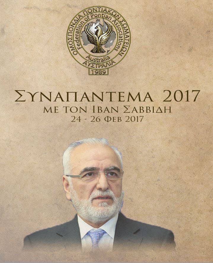 «По моей инициативе приглашен президент Ассоциации Греческих Общественных Объединений России Иван Саввиди для участия в ежегодной Встрече понтийских греков Австралии. Принято решение отметить его деятельность во благо эллинизма диаспоры. Нам предоставится исключительная возможность обсудить темы, волнующие греков всего мира и обдумать пути возможной консолидации наших усилий на мировом уровне.