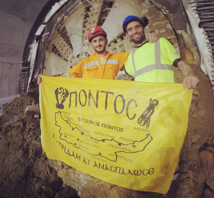 Κάτω, όμως, από την επιφάνεια της γης η «κατάκτηση» του στόχου γιορτάστηκε με δύο σημαίες: την ελληνική και εκείνη που έχει πάνω της το χάρτη του Πόντου, σε κίτρινο φόντο. Με τη δεύτερη σημαία ποζάρουν χαμογελαστοί ο Ηλίας Σταυριανίδης και ο Χαράλαμπος Συμεωνίδης, ηλεκτρολόγος και «πιλότος» του μηχανήματος αντίστοιχα.