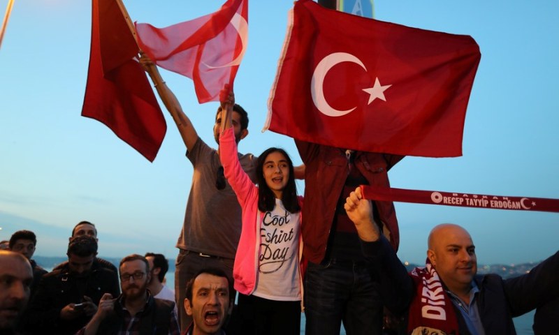 Υποστηρικτές του Ερντογάν πανηγυρίζουν για το αποτέλεσμα του δημοψηφίσματος έξω από το προεδρικό μέγαρο στην Άγκυρα (φωτ.: EPA / Tumay Berkin)