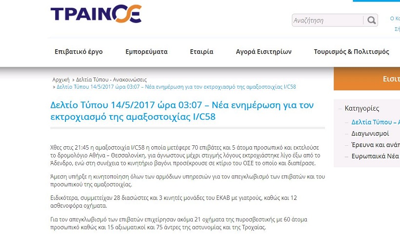 Η νεότερη ανακοίνωση αναφέρει ότι: «Χθες στις 21:45 η αμαξοστοιχία I/C58 η οποία μετέφερε 70 επιβάτες και 5 άτομα προσωπικό και εκτελούσε το δρομολόγιο Αθήνα-Θεσσαλονίκη, για άγνωστους μέχρι στιγμής λόγους εκτροχιάστηκε λίγο έξω από το Άδενδρο, ενώ στη συνέχεια το κινητήριο βαγόνι προσέκρουσε σε κτίριο του ΟΣΕ το οποίο και διαπέρασε».