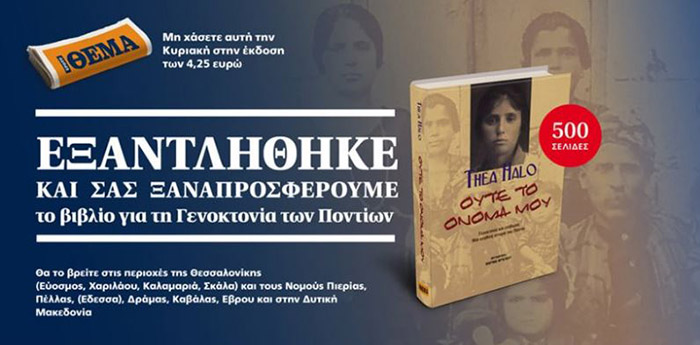 Εξαντλήθηκε την περασμένη Κυριακή το ΘΕΜΑ που σε ένδειξη τιμής και σεβασμού στον ποντιακό ελληνισμό πρόσφερε στους αναγνώστες του το βιβλίο της Thea Halo Ούτε το όνομα μου.