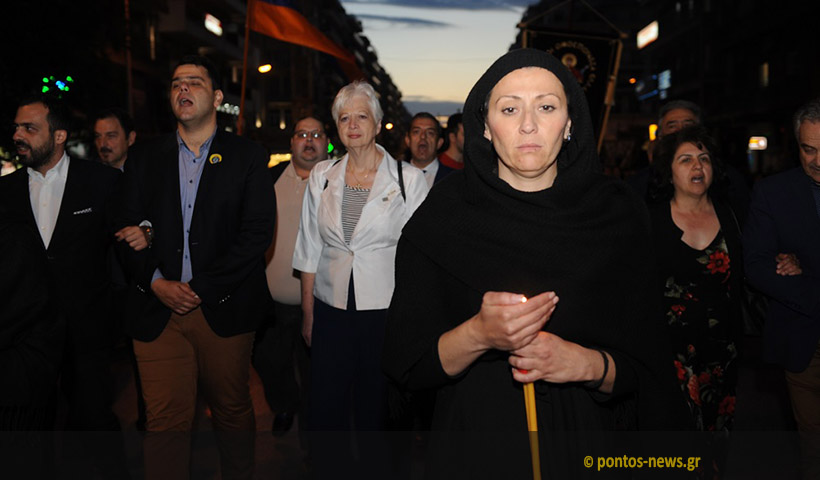 Στη κορυφή της βρίσκονταν μαυροφορεμένες γυναίκες με αναμμένα κεριά, ακολουθούσαν επίσημοι και αμέσως μετά το λάβαρο της ΠΟΕ, το οποίο είχε στα δεξιά του μια αρμενική σημαία και στα αριστερά του σημαίες της Ελλάδας και του Πόντου.