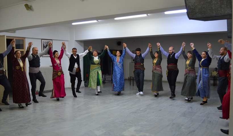Μέλη του χορευτικού τμήματος φορώντας τα βασικά κομμάτια της ποντιακής παραδοσιακής φορεσιάς κάνουν μια χαλαρή πρόβα, ένα «πέρασμα» σε ολόκληρο το πρόγραμμα που θα παρουσιάσουν. Η Σοφία Σαββουλίδου, τις οδηγίες της οποίας ακολουθούν οι χορευτές, τονίζει κάποιες σημαντικές λεπτομέρειες.