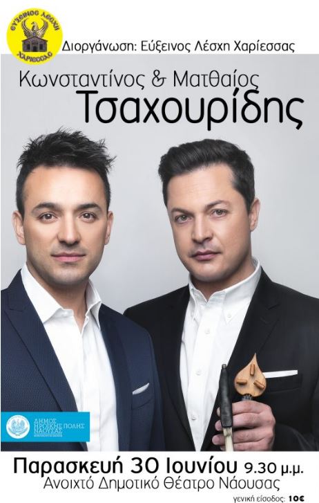 Με στόχο να προσελκύσει νέους ανθρώπους κοντά στην παράδοση –και δη την ποντιακή–, αλλά και να μεταλαμπαδεύσει σε αυτούς την αγάπη των παλαιότερων για την αλησμόνητη πατρίδα, τον Πόντο και τον πολιτισμό της, η Εύξεινος Λέσχη Χαρίεσσας Νάουσας διοργανώνει μια συναυλιακή βραδιά με τους αδελφούς Ματθαίο και Κωνσταντίνο Τσαχουρίδη, δύο πασίγνωστους Πόντιους καλλιτέχνες οι οποίοι κατάγονται από την Ημαθία.