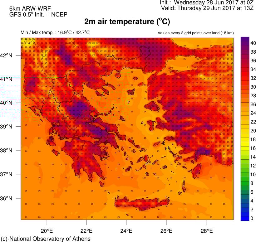Σε Θεσσαλία, ανατολική Στερεά, Εύβοια και ανατολική Πελοπόννησο γενικά αίθριος καιρός και άνεμοι μεταβλητοί 3 με 4 και πρόσκαιρα το μεσημέρι-απόγευμα από δυτικές διευθύνσεις έως 5 μποφόρ. Η θερμοκρασία από 23 έως 39 και κατά τόπους έως 41 βαθμούς Κελσίου.