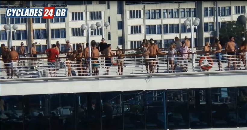 Κατά τη διάρκεια της 8ήμερης ροζ κρουαζιέρας θα υπάρχουν και ερωτικά παιχνίδια και live σόου. Στις αποκλειστικές φωτογραφίες του Cyclades24.gr από τον απόπλου του Αmazara Quest διακρίνονται ημίγυμνα ζευγάρια στο κατάστρωμα του πλοίου.