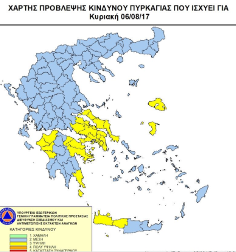 Υψηλός για ακόμη μία ημέρα παραμένει ο κίνδυνος πυρκαγιάς, σύμφωνα με χάρτη πρόβλεψης κινδύνου πυρκαγιάς της γ.γ. Πολιτικής Προστασίας. Ειδικότερα, υψηλός κίνδυνος (δείκτης 3) προβλέπεται για τους νομούς Αττικής, Βοιωτίας, Φθιώτιδας, Εύβοιας, Κορινθίας, Αργολίδας, Αχαΐας, Ηλείας, Λακωνίας και για τα νησιά Κρήτη, Λέσβος, Χίος και Κύθηρα, όπου μαίνεται για τρίτη ημέρα η μεγάλη πυρκαγιά.
