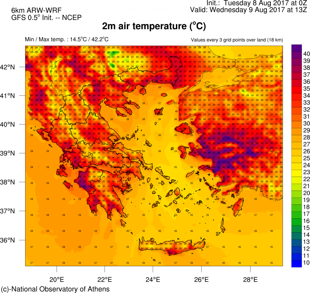 Σε Μακεδονία και Θράκη γενικά αίθριος καιρός. Τοπικές νεφώσεις τις απογευματινές ώρες με πρόσκαιρες καταιγίδες κυρίως στη Μακεδονία. Οι άνεμοι μεταβλητοί 3 με 4 και στα ανατολικά ανατολικοί βορειοανατολικοί τοπικά έως 5 μποφόρ. Η θερμοκρασία από 22 έως 38 και κατά τόπους έως 39 βαθμούς Κελσίου. Στη δυτική Μακεδονία η ελάχιστη 3 με 4 βαθμούς χαμηλότερη.