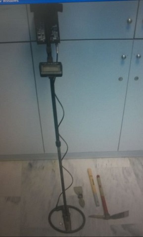 Αμέσως κάλεσε την αστυνομία που όταν έφθασε στο σημείο του έκανε έλεγχο. Βρέθηκαν και κατασχέθηκαν οκτώ αρχαία μεταλλικά νομίσματα και διάφορα άλλα μεταλλικά αντικείμενα που εμπίπτουν στη νομοθεσία «Περί προστασίας αρχαιοτήτων», μια συσκευή ανίχνευσης μετάλλων και δύο σκαπάνες με ξύλινο κοντάρι.