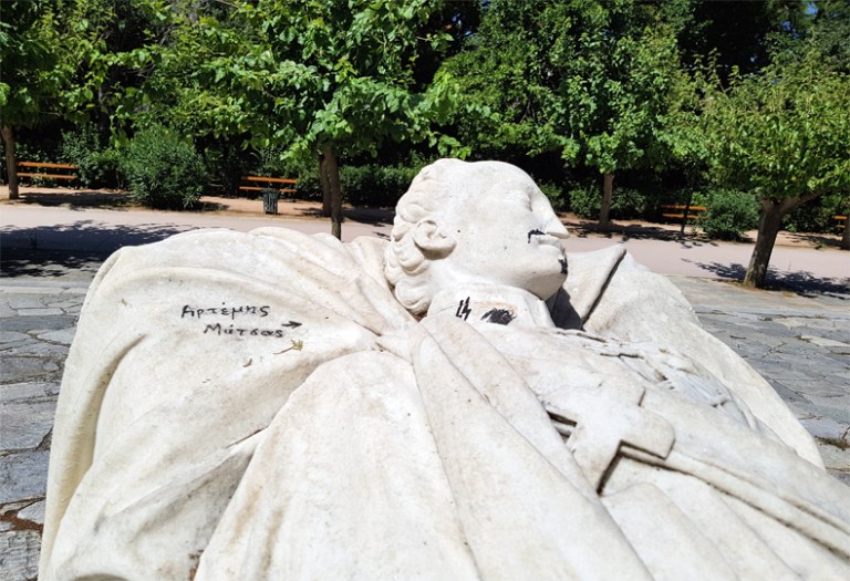Η ίδια επισημαίνει ότι η βεβήλωση των αγαλμάτων στο Πεδίο του Άρεως είναι σύνηθες φαινόμενο. Πριν από λίγο καιρό «θύμα» βεβήλωσης έπεσε το άγαλμα της Μπουμπουλίνας, τώρα ήρθε η σειρά του Υψηλάντη, όπως λέει.