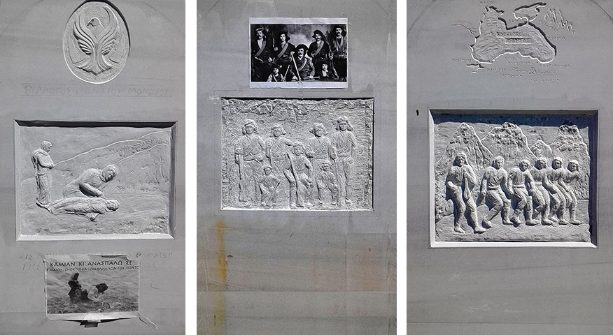 Οι τρεις μαρμάρινες πλάκες, ύψους 1,80 μ., που θα αποτελέσουν το μνημείο· ο (και πολιτισμολόγος) γλύπτης Λυκούργος, μικρασιατικής καταγωγής, πέρασε ώρες μελέτης για τον πυρρίχιο, το αντάρτικο του Πόντου, την Πόντια μάνα…