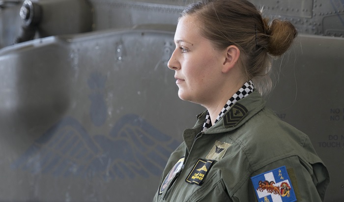 «Ειδικότητα τεχνίτης ηλεκτρονικών, ηλεκτρολογικών και οπλικών συστημάτων του επιθετικού ελικοπτέρου Απάτσι Δέλτα», απαντά ορθά κοφτά η επιλοχίας Αεροπορίας Στρατού Όλγα Τσακνάκη, που όπως φαίνεται δεν βρέθηκε τυχαία να εργάζεται σε έναν χώρο που θεωρείται ανδροκρατούμενος.