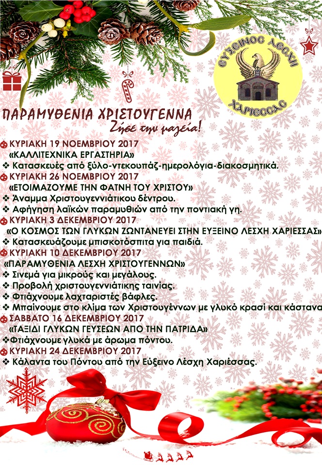 H Εύξεινος Λέσχη Χαρίεσσας (ΕΛΧ) ενώνει τις δυνάμεις της για 3η συνεχόμενη χρονιά, για τη δημιουργία και την υλοποίηση ενός εορταστικού προγράμματος για μικρούς και μεγάλους. Όπως αναφέρει σε ανακοίνωσή της, έχει τη χαρά να παρουσιάσει ένα ιδιαίτερα όμορφο πρόγραμμα για τα Χριστούγεννα, ικανό να καλύψει όλες τις επιθυμίες και να σκορπίσει όμορφα συναισθήματα.