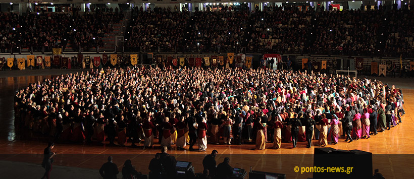 Η συγκίνηση ήταν διάχυτη στις τάξεις των θεατών και όχι μόνο – ειδικά όταν μετά την ταινία έκαναν την είσοδό τους περήφανα στην πελώρια σκηνή οι 2.500 χορευτές με το χορό ομάλ’ Κερασούντας. Ακολούθησαν οι ομιλίες του προέδρου του ΣΠΟΣ Νοτίου Ελλάδος και Νήσων Γιώργου Βαρυθυμιάδη και του προέδρου της ΠΟΕ Χρήστου-Δημήτριου Τοπαλίδη. Τη σκυτάλη πήραν οι Σύνδεσμοι Ποντιακών Σωματείων από όλη την Ελλάδα χαρίζοντας μοναδικό θέαμα και ρίγη συγκίνησης στους χιλιάδες θεατές που βρέθηκαν απόψε στο ΣΕΦ. Οι χορευτές περήφανα χτύπησαν τα πόδια τους ρυθμικά στους σκοπούς της αλησμόνητης γης του Πόντου, όπου για χιλιάδες χρόνια ανθούσε ο ελληνισμός. Η ατμόσφαιρα ήταν σχεδόν μυσταγωγική, με το φωτισμό να υποβάλλει όλο τον κόσμο στο κλειστό γήπεδο.