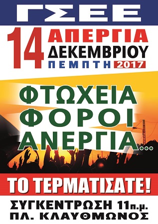 «Με βασικό σύνθημα “Το τερματίσατε” οι εργαζόμενοι απεργούν και διαδηλώνουν, αντιδρώντας στην αντεργατική και φορομπηχτική πολιτική, η οποία συνεχίζεται και αποτυπώνεται και στο νέο προϋπολογισμό, αλλά και σε κάθε μέτρο και στόχευση που οδηγεί σε περαιτέρω αύξηση της ανεργίας, σε ανακύκλωση της ύφεσης, σε κρατικό και εργοδοτικό παρεμβατισμό στην άσκηση των συλλογικών τους δικαιωμάτων», υπογραμμίζει η ΓΣΕΕ.