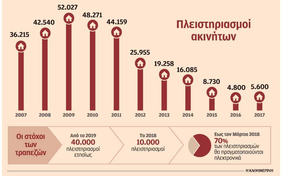 Έναν φιλόδοξο στόχο περιλαμβάνει η Κομισιόν στην έκθεση συμμόρφωσης της Ελλάδας με τα προαπαιτούμενα της γ’ αξιολόγησης: φέτος οι πλειστηριασμοί ακινήτων θα πρέπει να φτάσουν τους 10.000, ενώ από το 2019 και μετά οι πλειστηριασμοί που θα γίνονται κάθε χρόνο θα πρέπει να φτάνουν τους 40.000. Με δεδομένο ότι τον τελευταίο μήνα του 2017 πραγματοποιήθηκαν μόλις 30 ηλεκτρονικοί πλειστηριασμοί, και τον Ιανουάριο ο στόχος ανεβαίνει στους 500, αν και το σύστημα δεν έχει αναπτυχθεί πλήρως ακόμα, ο πήχης των 10.000 φαίνεται να είναι πολύ ψηλά.