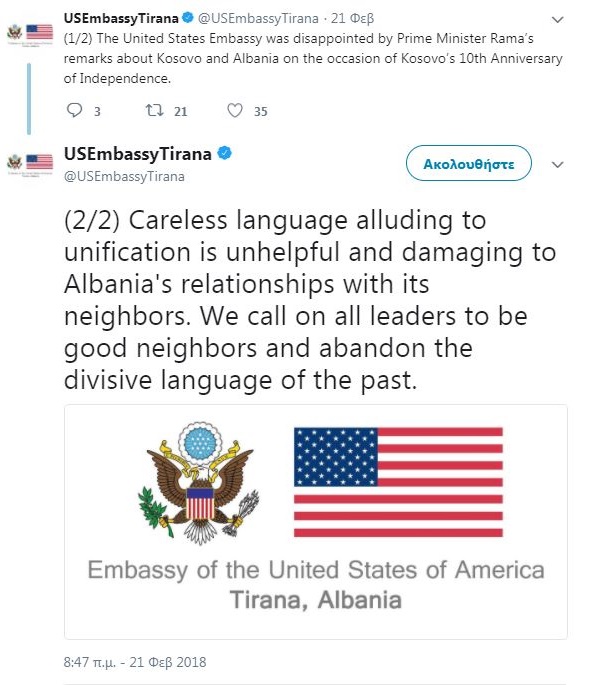 Με ανάρτηση στο Twitter, η αμερικανική πρεσβεία στα Τίρανα εξέφρασε τη δυσαρέσκεια των ΗΠΑ για την «απρόσεχτη ρητορική» που βλάπτει τις σχέσεις της Αλβανίας με τους γείτονές της.