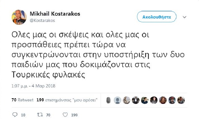 «Όλες μας οι σκέψεις και όλες μας οι προσπάθειες πρέπει τώρα να συγκεντρώνονται στην υποστήριξη των δύο παιδιών μας που δοκιμάζονται στις τουρκικές φυλακές», έγραψε στην ανάρτησή του ο Μιχαήλ Κωσταράκος.