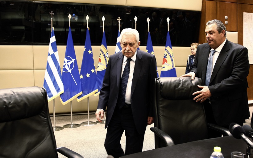 Ο υπουργός Εθνικής Άμυνας Πάνος Καμμένος με τον αναπληρωτή υπουργό Φώτη Κουβέλη προσέρχονται στη συνέντευξη Τύπου (φωτ.: ΑΠΕ-ΜΠΕ / Αλέξανδρος Βλάχος)