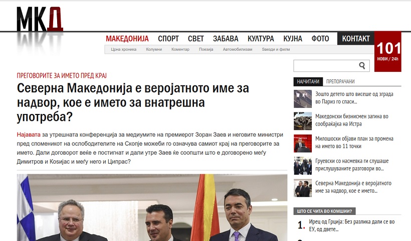 «Η Βόρεια Μακεδονία είναι ένα πιθανό όνομα για τη διεθνή χρήση, ποιο είναι το όνομα για την εσωτερική;», είναι ο τίτλος δημοσιεύματος της σκοπιανής ιστοσελίδας MKD. Όπως σημειώνει, η ανακοίνωση της συνέντευξης Τύπου (Τετάρτη) του Ζόραν Ζάεφ στο μνημείο των Απελευθερωτών των Σκοπίων σηματοδοτεί, ίσως, και το τέλος των διαπραγματεύσεων για το ονοματολογικό.