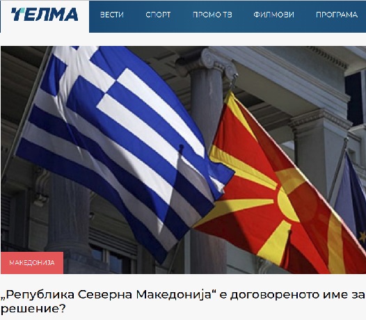 Το τηλεοπτικό κανάλι «Telma» της πΓΔΜ, το οποίο επικαλείται διπλωματικές πηγές, υποστηρίζει ότι το όνομα «Δημοκρατία της Βόρειας Μακεδονίας» είναι πιθανόν αυτό που συμφωνήθηκε στις επαφές του υπουργού Εξωτερικών με τον Σκοπιανό ομόλογό του στις Βρυξέλλες.
