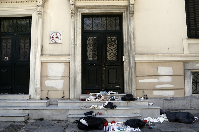 Σκουπίδια πέταξαν στην είσοδο του κτηρίου όπου στεγάζεται η ΑΔΕΔΥ, κατά τη διάρκεια διαμαρτυρίας στο κέντρο της Αθήνας (φωτ.: ΑΠΕ-ΜΠΕ / Γιάννης Κολεσίδης)