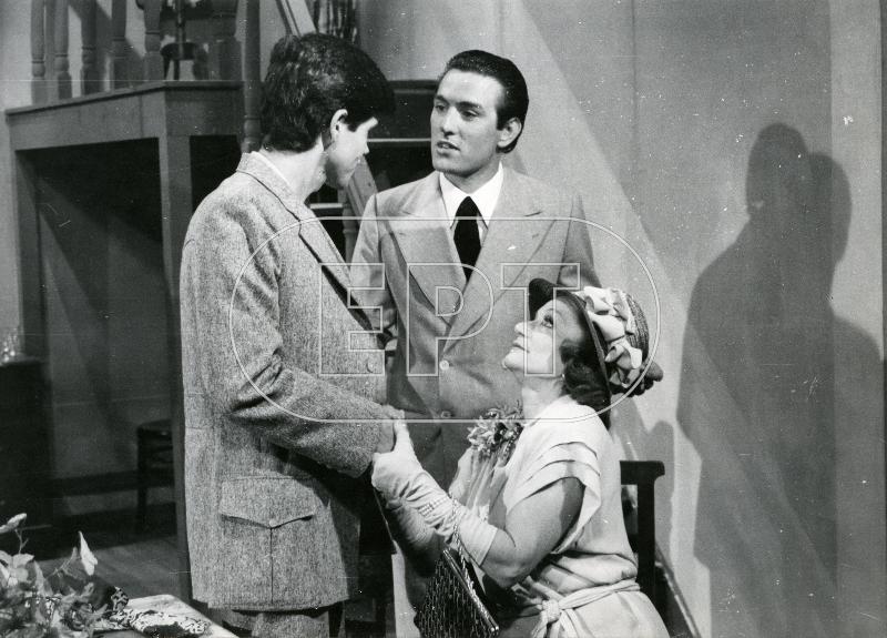 Στιγμιότυπο από την εκπομπή Θέατρο της Δευτέρας με τον Νίκο Χύτα να διακρίνεται στο κέντρο και την ηθοποιό Αγνή Βλάχου να είναι καθιστή, στο έργο Χαβιάρι και φακές των Τζούλιο Σκαρνίτσι- Ρ. Ταραμπούζι (φωτ.: Αρχείο ΕΡΤ)