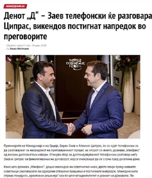 Τις τελευταίες ώρες παρατηρείται κινητικότητα στο Σκοπιανό και δημοσιογραφικές πληροφορίες από την πρωτεύουσα της πΓΔΜ αναφέρουν πως μάλλον σήμερα θα γίνει το πολυαναμενόμενο τηλεφώνημα από τον Ζόραν Ζάεφ στον Αλέξη Τσίπρα. Την είδηση μετέδωσε το σκοπιανό πρακτορείο makfax.