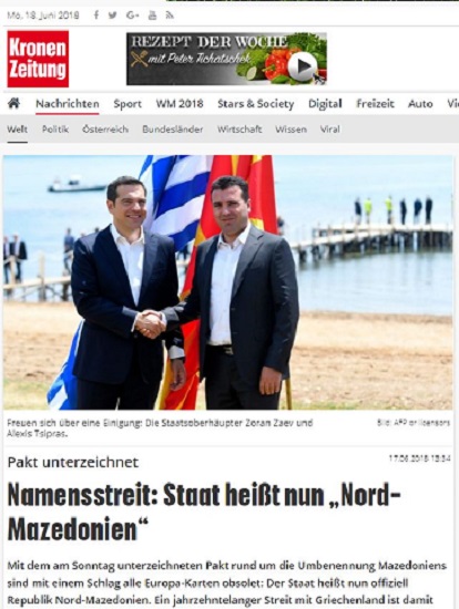 Με την υπογραφή χθες Κυριακή της συμφωνίας και την αλλαγή του ονόματος της πΓΔΜ ακυρώνονται διαμιάς όλοι οι χάρτες της Ευρώπης, καθώς το κράτος ονομάζεται πλέον επίσημα Δημοκρατία Βόρειας Μακεδονίας και διευθετείται με τον τρόπο αυτό μια διαφορά δεκαετιών με την Ελλάδα, αναφέρει σημερινό δημοσίευμα της μεγαλύτερης κυκλοφορίας αυστριακής εφημερίδας Kronen Zeitung, υπό τον τίτλο «Διένεξη για το όνομα: Η χώρα ονομάζεται τώρα Βόρεια Μακεδονία».
