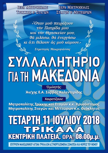 Το συλλαλητήριο συνδιοργανώνουν οι Ιερές Μητροπόλεις Τρίκκης & Σταγών και Σταγών & Μετεώρων και η Επιτροπή Μακεδονικού Αγώνα Τρικάλων.