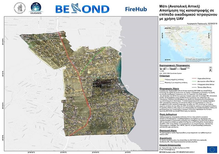 Ο χάρτης του Κέντρου Διαχείρισης Φυσικών Καταστροφών BEYOND του Ινστιτούτου Αστρονομίας, Αστροφυσικής, Διαστημικών Εφαρμογών & Τηλεπισκόπησης (ΙΑΑΔΕΤ) του Εθνικού Αστεροσκοπείου Αθηνών (ΕΑΑ) έχει τη λεπτομερή αποτίμηση της καταστροφής σε επίπεδο οικοδομικού τετραγώνου στον οικισμό Μάτι (Ανατολική Αττική) με συστήματα Drones/UAV υπερυψηλής χωρικής ανάλυσης (3,5 εκατοστά).
