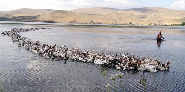 Στη φωτογραφία βλέπουμε ένα κοπάδι από εκατοντάδες οικόσιτες χήνες, τις οποίες ο βοσκός έβγαλε στα λιβάδια για βοσκή κι αυτές κάνουν το μπάνιο τους σε μικρή λίμνη.