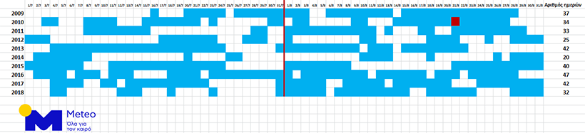 Αναλυτικότερα, οι μέρες των μελτεμιών της τελευταίας δεκαετίας στο Αιγαίο κατά το δίμηνο Ιουλίου-Αυγούστου είχαν ως εξής: 37 μέρες το 2009, 34 μέρες το 2010, 33 μέρες το 2011, 25 μέρες το 2012, 42 μέρες το 2013, 20 μέρες το 2014, 40 μέρες το 2015, 47 μέρες το 2016, 42 μέρες το 2017 και 32 μέρες το 2018.
