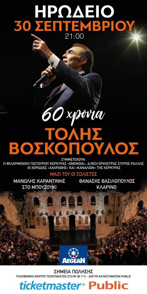 Απόλυτο είδωλο επί δεκαετίες, ο Τόλης Βοσκόπουλος τραγουδά για τον έρωτα, την αγάπη, τον πόνο και το χωρισμό με έναν τρόπο που συγκινεί όποιον μυηθεί στο έργο του. Ένα έργο 60 ετών που θα έχουν τη χαρά να ακούσουν όλοι όσοι βρεθούν την Κυριακή 30 Σεπτεμβρίου, στις 21:00, στο Ηρώδειο, σε μια βραδιά που θα είναι κάτι περισσότερο από βραδιά μνήμης και τιμής.